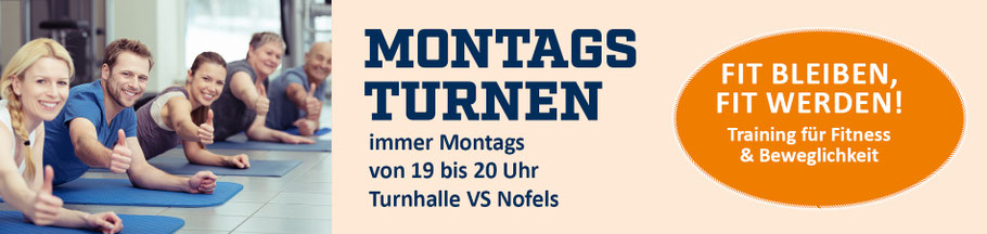Das Montagsturnen ist seit Jahrzehnten ein Fixbestandteil im Angebot des WSV Nofels. Viele Turner:innen sind seit Jahren jeden Montag dabei, wenn unsere Vorturnerinnen Conny und Petra die Matten ausrollen, die Musik aufgedreht und mit der Gymnastik losgelegt wird.